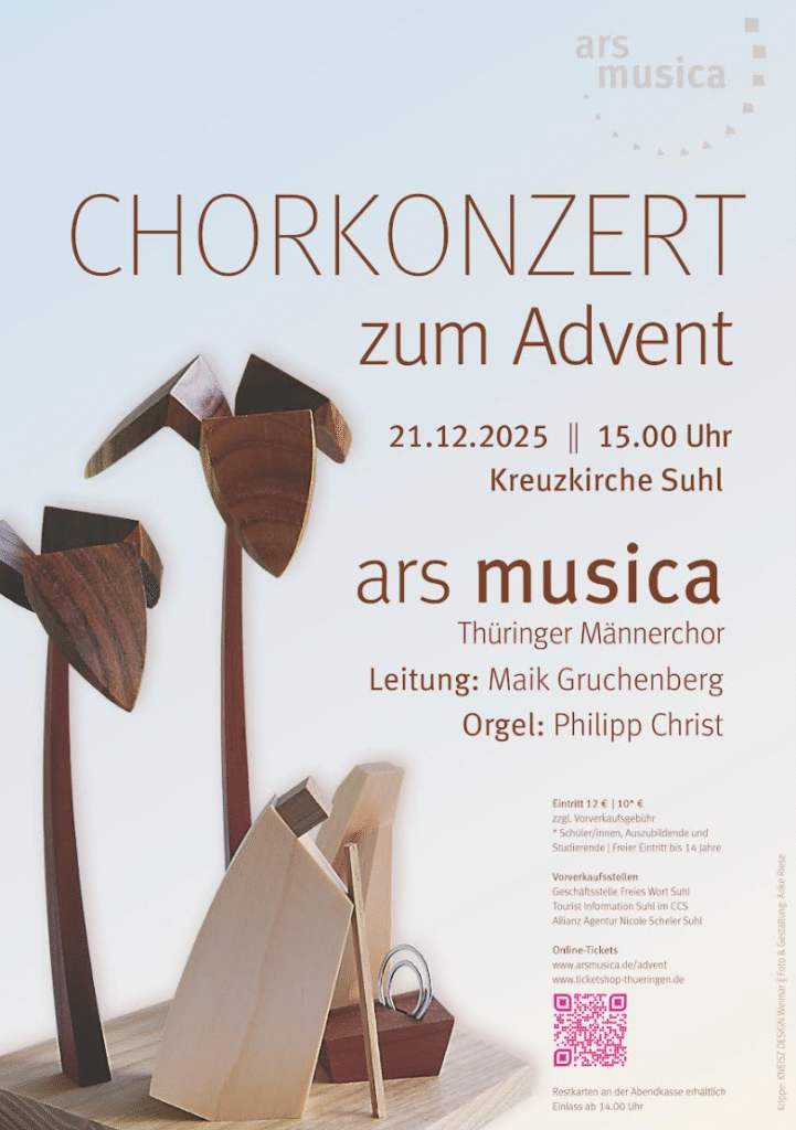 Heute zählt „Ars Musica“ über 30 Sänger im Alter zwischen 20 und 60 Jahren und ist Mitglied im Verband Deutscher Konzertchöre. Die Wurzeln des Ensembles reichen bis ins Jahr 1972 zurück, als Hubert Voigt den Suhler Knabenchor ins Leben rief. Seit 2018 liegt die künstlerische Leitung in den Händen von Maik Gruchenberg.
